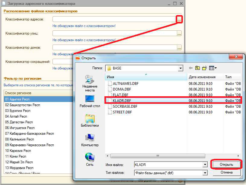В окне загрузки адресного классификатора необходимо указать расположение файлов для загрузки: